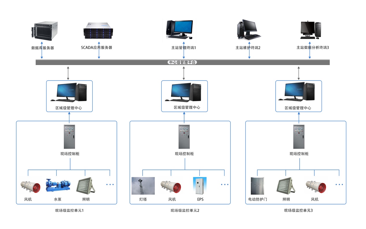 公共防災(zāi)救援設(shè)備監(jiān)控系統(tǒng)采用多層分級結(jié)構(gòu),自上而下劃分為中心級管理平臺、區(qū)域級管理中心和現(xiàn)場級監(jiān)控單元。其中現(xiàn)場級監(jiān)控單元包括水泵,風(fēng)機(jī),照明,電動防護(hù)門,燈塔,EPS等現(xiàn)場設(shè)備以及負(fù)責(zé)現(xiàn)場設(shè)備監(jiān)控的現(xiàn)場控制柜。