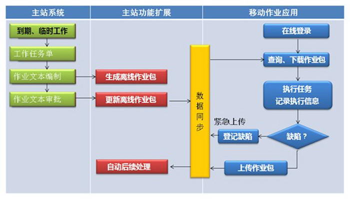 系統(tǒng)將任務(wù)分配(調(diào)度)給運維人員, 運維人員即可通過移動終端下載任務(wù),然后離線現(xiàn)場作業(yè),并將現(xiàn)場作業(yè)內(nèi)容及時錄入(文字,語音,圖片,視頻)系統(tǒng),最后再將工作記錄上傳至服務(wù)器.